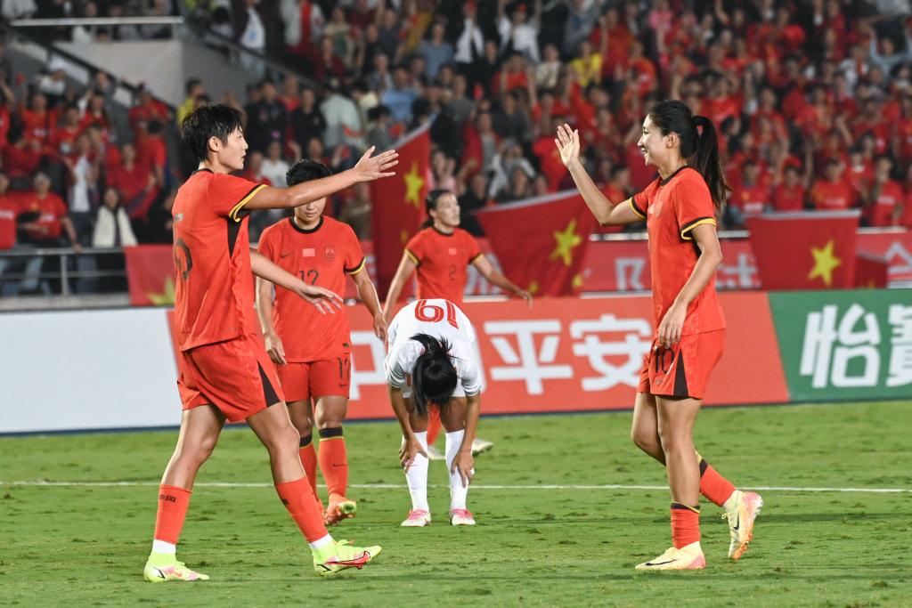 10月29日,中國隊球員袁叢(前左)和王妍雯(前右)慶祝進球。新華社記者 張子彧 攝