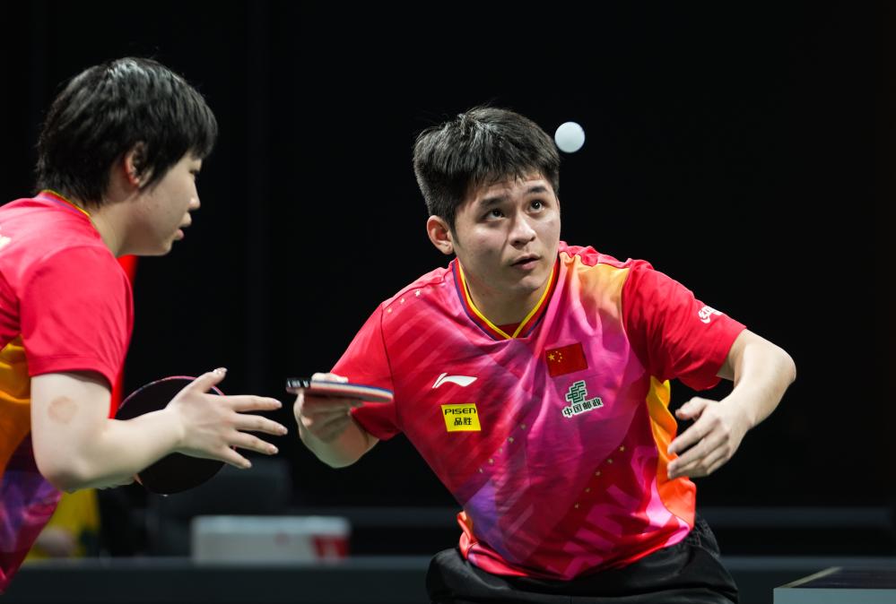 12月1日,中國(guó)隊(duì)組合林詩(shī)棟(右)/蒯曼在混雙比賽中。新華社記者 江宏景 攝