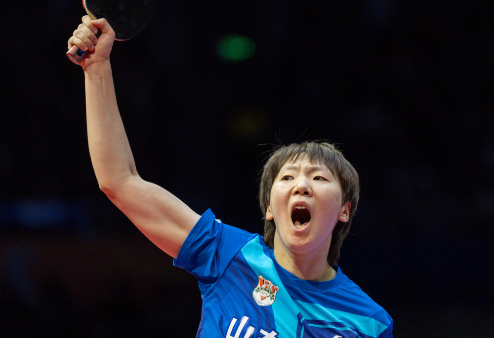 1月1日,深圳大學(xué)隊(duì)選手孫穎莎在單打比賽后慶祝勝利。新華社記者 孫非 攝