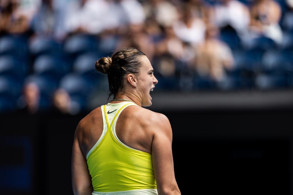 1月15日,薩巴倫卡在比賽中慶祝得分。新華社發(fā)(胡涇辰攝)