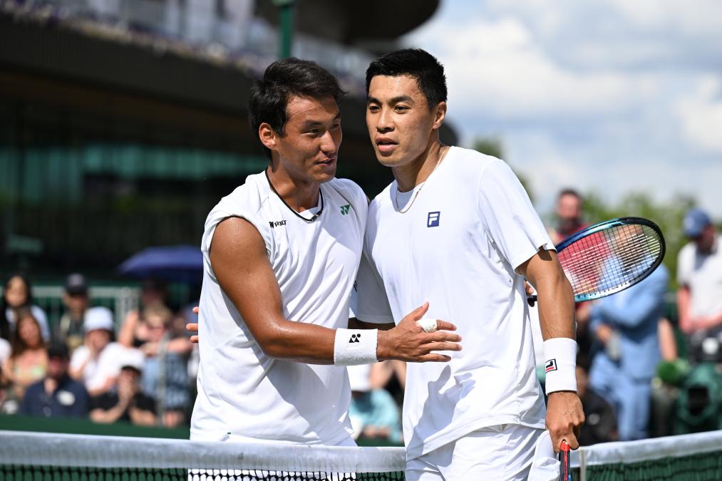 7月2日,布云朝克特(左)在賽后與中島布蘭登致意。新華社記者 趙丁喆 攝