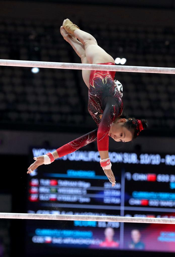 10月21日,中國(guó)選手張清穎在高低杠項(xiàng)目比賽中。新華社發(fā)(阿貢·昆卡亞攝)