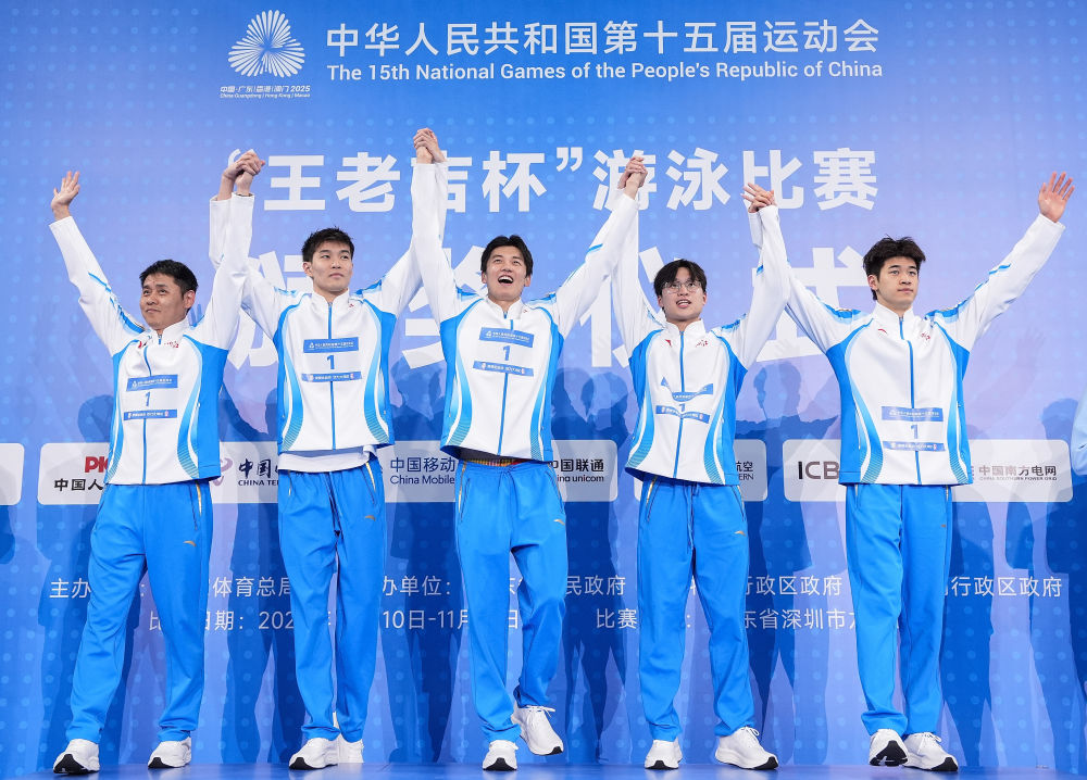 11月10日,冠軍浙江隊(duì)選手和教練在頒獎(jiǎng)儀式上。當(dāng)日,第十五屆全國運(yùn)動(dòng)會(huì)游泳項(xiàng)目男子4X100米自由泳接力決賽在深圳舉行。新華社記者 杜宇 攝
