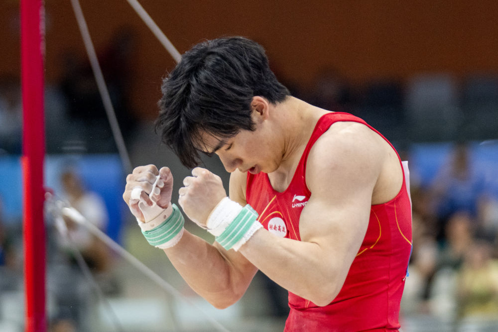 體操賽場(chǎng),湖南名將張博恒在幾次沖金受挫后,以一套干凈利落的動(dòng)作問鼎男子單杠;四川隊(duì)鄒敬園則加冕男子雙杠。