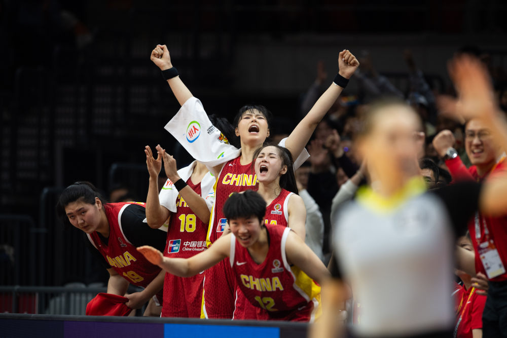 3月15日,在武漢舉行的2026年女籃世界杯資格賽A組比賽中,中國隊84:74戰(zhàn)勝捷克隊。圖為中國隊球員在場邊慶祝得分。新華社記者 肖藝九 攝