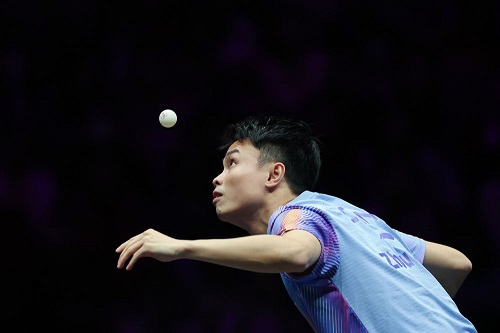 3月13日,周啟豪在世界乒乓球職業(yè)大聯(lián)盟(WTT)重慶冠軍賽男子單打八分之一決賽中。新華社記者 黃偉 攝