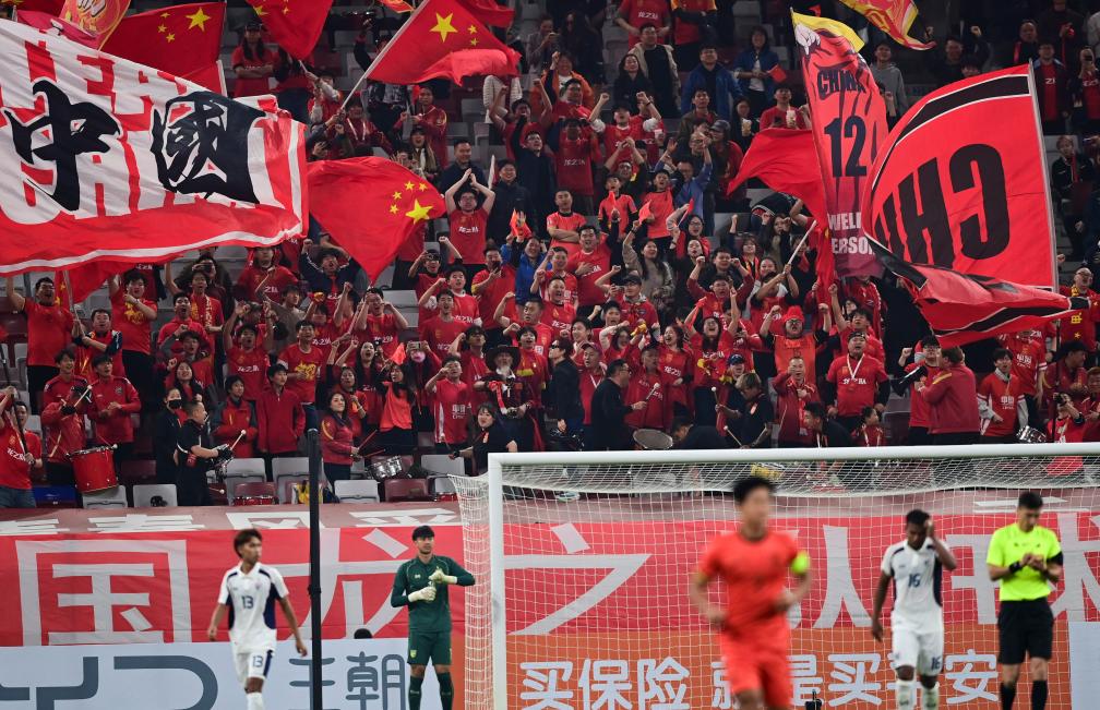 3月25日,球迷在中國隊(duì)進(jìn)球后慶祝。新華社記者 鄒競一 攝
