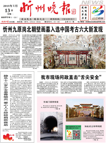 2015年1月9日上午,從中國社會科學院學術(shù)報告廳舉行的“中國社會科學院考古學論壇·2014年中國考古新發(fā)現(xiàn)”上傳來消息,論壇評審委員會從全國考古機構(gòu)推薦的數(shù)十項2014年全國最新考古發(fā)現(xiàn)中遴選出六項重要發(fā)現(xiàn),其中忻州市九原崗北朝壁畫墓,同甘肅肅北縣馬鬃山玉礦遺址、云南祥云縣大波那墓地、西藏阿里地區(qū)故如甲木墓地和曲踏墓地、內(nèi)蒙古陳巴爾虎旗崗嘎墓地、貴州遵義市新蒲播州楊氏土司墓地一同入選。