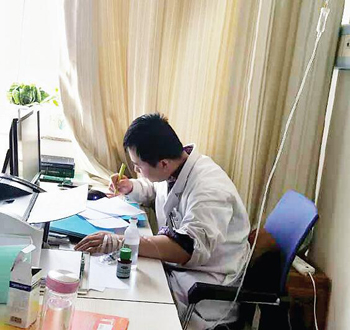 3月10日起,在微信朋友圈里,這張醫(yī)生掛吊瓶接診的照片引起了很多人的關(guān)注。照片中一名身穿白大褂的醫(yī)生正在值班室埋頭寫病歷,他的一只手上正輸著液體。筆者了解到,是一名病人的家屬上傳了這張照片。他的父親十幾天前曾在中醫(yī)院9樓心血管病房住院,在父親住院的一天,他去值班室詢問父親病情時(shí),看到了徐強(qiáng)醫(yī)生打吊瓶堅(jiān)持工作,這讓他十分感動(dòng),于是就悄悄用手機(jī)拍了照并上傳至微信朋友圈。
