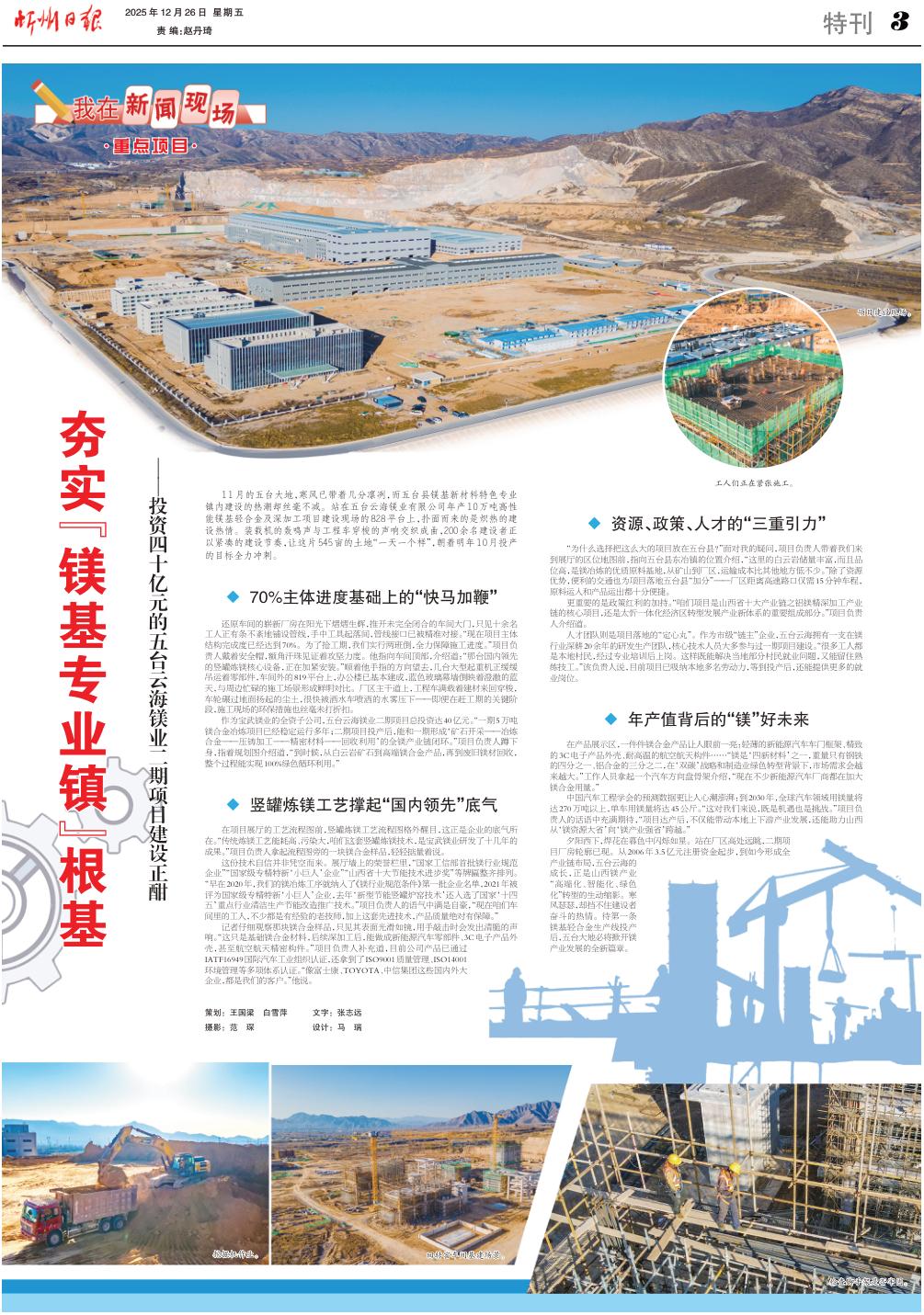 夕陽西下,焊花在暮色中閃爍如星。站在廠區(qū)高處遠(yuǎn)眺,二期項(xiàng)目廠房輪廓已現(xiàn)。從2006年3.5億元注冊(cè)資金起步,到如今形成全產(chǎn)業(yè)鏈布局,五臺(tái)云海的成長,正是山西鎂產(chǎn)業(yè)“高端化、智能化、綠色化”轉(zhuǎn)型的生動(dòng)縮影。寒風(fēng)瑟瑟,卻擋不住建設(shè)者奮斗的熱情。待第一條鎂基輕合金生產(chǎn)線投產(chǎn)后,五臺(tái)大地必將掀開鎂產(chǎn)業(yè)發(fā)展的全新篇章。