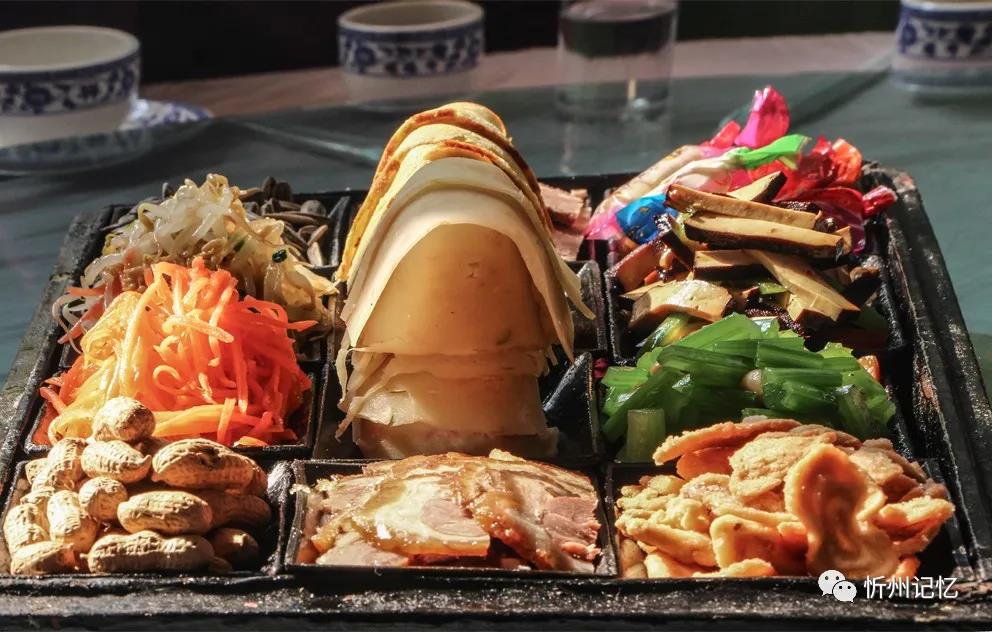 水菜盒子,是一個木制的長方形盒子,長約40多厘米,寬約20多厘米,高約10多厘米。木盒分蓋子和底座,底色多漆為紅黑兩色。蓋子上有的還畫有人物、山水、花卉等圖案,為描金漆處理。底座內(nèi)有12個木制的小長方形碟子,以3行4列的形式排列,用來裝涼拌菜。傳統(tǒng)的涼拌菜為四葷、二素、六干果,但后來大多演變?yōu)樗娜?、四素、四干果。其中的“四葷”為雞蛋餅、冷片肉、蒸肉、鹵肉;“四素”幾乎全是清淡的蔬菜,如綠豆芽、胡蘿卜、土豆絲、菠菜、胡芹等;“六干果”分別是葵花子、水果糖、南瓜子、油蛋蛋、金銀棗、蝦片。在忻府區(qū),過去家家戶戶但凡婚喪嫁娶,總要上水菜盒子,這就是老忻州人好說的“八八六六”。其中“八八”即水菜盒子(除去里面的干果正好8小碟菜),代表涼菜。