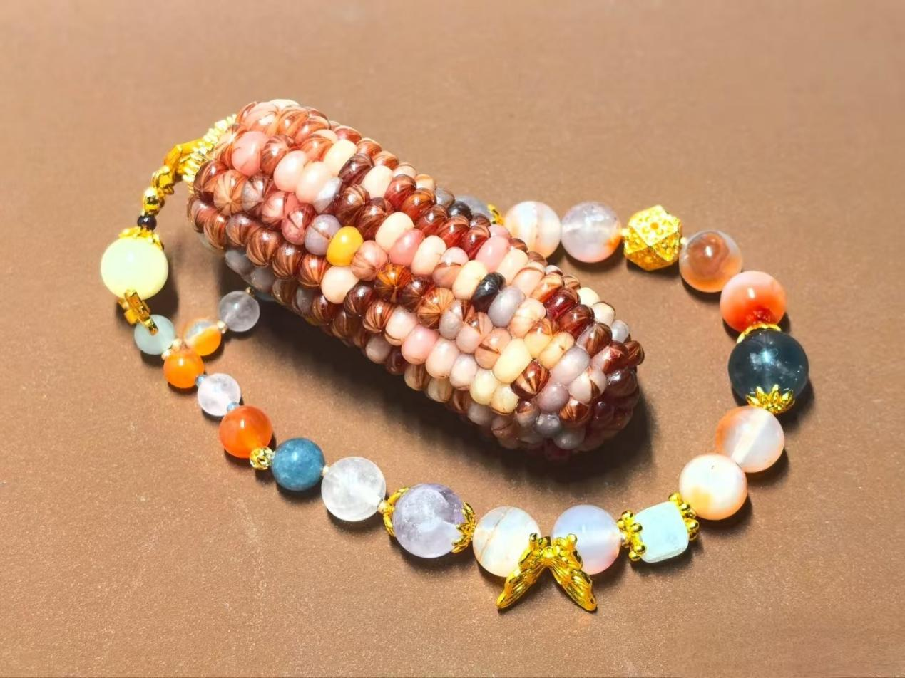 經(jīng)自然晾曬、人工精選、手工創(chuàng)意后,高顏值的玉米迎來了“七十二變”:配上木質(zhì)底座成為文玩擺件,單粒打孔輔以云南銀飾變成手鏈、鑰匙扣,掛飾、裝飾畫等。