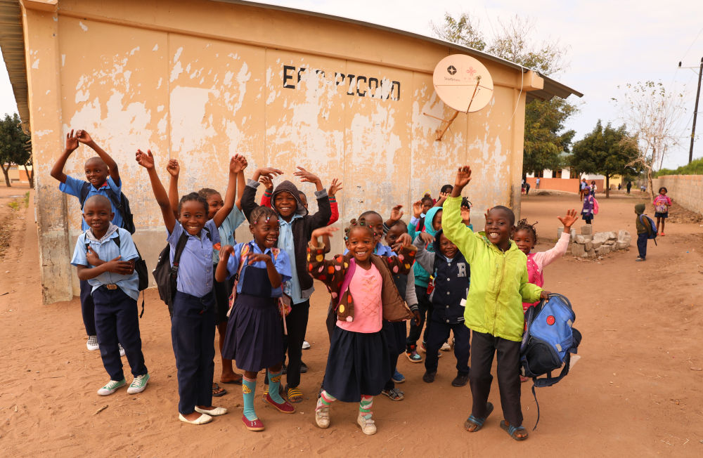 2023年7月25日,莫桑比克馬普托省皮科科村學(xué)校的孩子們站在裝有中國(guó)援助的衛(wèi)星電視接收天線的房屋前?!叭f(wàn)村通”項(xiàng)目旨在為非洲國(guó)家的1萬(wàn)個(gè)村莊接入衛(wèi)星數(shù)字電視信號(hào),項(xiàng)目2018年在莫桑比克啟動(dòng),為該國(guó)1000個(gè)村落、2萬(wàn)戶(hù)家庭和3000個(gè)公共場(chǎng)所安裝衛(wèi)星電視設(shè)備,提供電視信號(hào)和節(jié)目,覆蓋農(nóng)村人口達(dá)250萬(wàn)。新華社記者 董江輝 攝