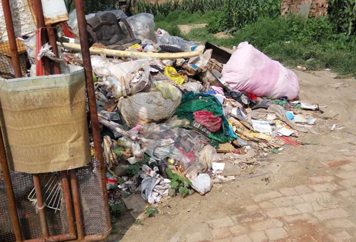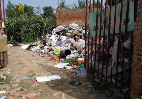 8月2日上午,在村民的陪同下來(lái)到匡村村南,在忻州烈士陵園背后一個(gè)叫周家(音)墳的地方,看到路口黑色的玉米桿躺放在井蓋上,生銹的用鋼管焊成的院門兩邊和門口,堆放著五顏六色的塑料袋以及廢塑料和破鐵桶等生活垃圾破爛,連院內(nèi)也同樣是垃圾。