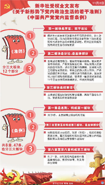 黨的十八屆六中全會(huì)審議通過的《關(guān)于新形勢(shì)下黨內(nèi)政治生活的若干準(zhǔn)則》和《中國共產(chǎn)黨黨內(nèi)監(jiān)督條例》,是新形勢(shì)下加強(qiáng)和規(guī)范黨內(nèi)政治生活、加強(qiáng)黨內(nèi)監(jiān)督的綱領(lǐng)性文獻(xiàn),是堅(jiān)持思想建黨和制度治黨相結(jié)合、推進(jìn)全面從嚴(yán)治黨形成的新制度安排,是對(duì)馬克思主義建黨理論和實(shí)踐的創(chuàng)新發(fā)展。 那么,新《準(zhǔn)則》《條例》“新”在哪里,為何“新”,“新”的意義是什么? 新形勢(shì): 世情國情黨情發(fā)生新變化 加強(qiáng)和規(guī)范黨內(nèi)政治生活、加強(qiáng)黨內(nèi)監(jiān)督,是新形勢(shì)下加強(qiáng)黨的建設(shè)的重要課題。這次六中全會(huì)制定準(zhǔn)則、修訂條例,正是著眼解決新形勢(shì)下黨內(nèi)突出問題而進(jìn)行的重要頂層設(shè)計(jì)。 習(xí)近平總書記強(qiáng)調(diào):“特別是要看到,新的歷史條件下,國際國內(nèi)形勢(shì)發(fā)生了很大變化,我們黨面臨的執(zhí)政環(huán)境和執(zhí)政條件發(fā)生了很大變化,黨面臨的‘四大考驗(yàn)’、‘四種危險(xiǎn)’是長期的、復(fù)雜的、嚴(yán)峻的”。換言之,世情國情黨情均發(fā)生了新的變化。 當(dāng)前,世界格局正在深刻調(diào)整,國內(nèi)格局正在深刻變革,中國發(fā)展仍處于可以大有作為的重要戰(zhàn)略機(jī)遇期,但戰(zhàn)略機(jī)遇期的內(nèi)涵正發(fā)生深刻變化,既面臨許多有利條件,也面臨不少風(fēng)險(xiǎn)挑戰(zhàn)。尤其是中國正面臨“中等收入陷阱”、“修昔底德陷阱”等挑戰(zhàn),決勝全面建成小康社會(huì)正處于關(guān)鍵階段。 具體說,后金融危機(jī)時(shí)代的西方國家正處于深度調(diào)整之中,中國等新興國家加速崛起,世界發(fā)展模式競爭呈現(xiàn)新態(tài)勢(shì)。中國作為世界第二大經(jīng)濟(jì)體,日益走向世界舞臺(tái)的中心,在全球治理體系中的地位和作用越來越重。中外互動(dòng)更趨復(fù)雜而敏感,中西制度模式、價(jià)值觀面臨更加直接的碰撞和較量。 另外,隨著改革開放不斷推進(jìn),社會(huì)主義市場經(jīng)濟(jì)不斷發(fā)展,大眾受教育程度不斷提高、互聯(lián)網(wǎng)時(shí)代的到來等,利益多元化、階層分化等趨勢(shì)加劇。國家治理更加復(fù)雜而敏感,面臨許多新的風(fēng)險(xiǎn)和挑戰(zhàn),全面深化改革進(jìn)入“攻堅(jiān)期”和“深水區(qū)”,每推進(jìn)一步,都要碰觸到利益關(guān)系和利益格局的調(diào)整,面臨思想觀念的障礙和利益固化的樊籬。 同時(shí),一段時(shí)間以來,黨的領(lǐng)導(dǎo)弱化、黨的建設(shè)缺失、全面從嚴(yán)治黨不力的現(xiàn)象不同程度存在。具體來說,一部分黨員、干部頭腦中黨的意識(shí)有所弱化,在堅(jiān)守黨的先進(jìn)性、純潔性命題上存在不少差距,脫離群眾的危險(xiǎn)在加大,還有少數(shù)黨員干部對(duì)馬克思主義、世界社會(huì)主義的前途、命運(yùn)產(chǎn)生了疑問、困惑,甚至有部分地區(qū)、部門以及黨員干部對(duì)黨中央權(quán)威的服從和維護(hù)不夠,這影響黨的執(zhí)政基礎(chǔ)和政治威信。 總之,執(zhí)政的形勢(shì)任務(wù)和黨內(nèi)情況發(fā)生了很大變化。新的歷史條件下,進(jìn)行具有許多新的歷史特點(diǎn)的偉大斗爭、推進(jìn)黨的建設(shè)新的偉大工程,必須針對(duì)新形勢(shì)新情況新問題,作出新規(guī)定、提出新要求。而“面對(duì)新的形勢(shì)和任務(wù),制定一個(gè)新形勢(shì)下黨內(nèi)政治生活的若干準(zhǔn)則,修訂黨內(nèi)監(jiān)督條例,時(shí)機(jī)成熟、條件具備,要求迫切,意義重大”。 新部署: 作出了新的制度安排 加強(qiáng)和規(guī)范黨內(nèi)政治生活、加強(qiáng)黨內(nèi)監(jiān)督,是新形勢(shì)下加強(qiáng)黨的制度化、組織化建設(shè)的重要課題,也是推進(jìn)全面從嚴(yán)治黨的重要抓手。 中國共產(chǎn)黨是一個(gè)擁有8800多萬黨員的大黨,是一個(gè)要在13億多人口大國長期執(zhí)政的黨,黨的制度化、組織化建設(shè)關(guān)系重大、牽動(dòng)全局?!拔幕蟾锩敝螅囆∑降戎醒腩I(lǐng)導(dǎo)人在總結(jié)歷史經(jīng)驗(yàn)和教訓(xùn)的基礎(chǔ)上,提出了制度建黨和依規(guī)治黨的治黨思路,并于1980年制定了《關(guān)于黨內(nèi)政治生活的若干準(zhǔn)則》。 這個(gè)準(zhǔn)則,是對(duì)馬克思主義建黨理論的豐富發(fā)展,具有開創(chuàng)性意義,其主要原則和規(guī)定今天仍然適用。但是,由于這個(gè)準(zhǔn)則針對(duì)的是當(dāng)時(shí)的歷史條件和主要矛盾,現(xiàn)在黨內(nèi)出現(xiàn)的一些突出矛盾和問題當(dāng)時(shí)尚未遇到,而當(dāng)時(shí)比較突出的一些矛盾和問題現(xiàn)在已經(jīng)不突出了。 黨的十八大以來,以習(xí)近平為核心的黨中央堅(jiān)持全面從嚴(yán)治黨,相繼在黨內(nèi)開展群眾路線教育實(shí)踐活動(dòng)、“三嚴(yán)三實(shí)”專題教育、“兩學(xué)一做”學(xué)習(xí)教育,為加強(qiáng)和規(guī)范黨內(nèi)政治生活、加強(qiáng)黨內(nèi)監(jiān)督積累了新經(jīng)驗(yàn)新舉措。 這次全會(huì)制定準(zhǔn)則、修訂條例,正是著眼于推進(jìn)全面從嚴(yán)治黨、堅(jiān)持思想建黨和制度治