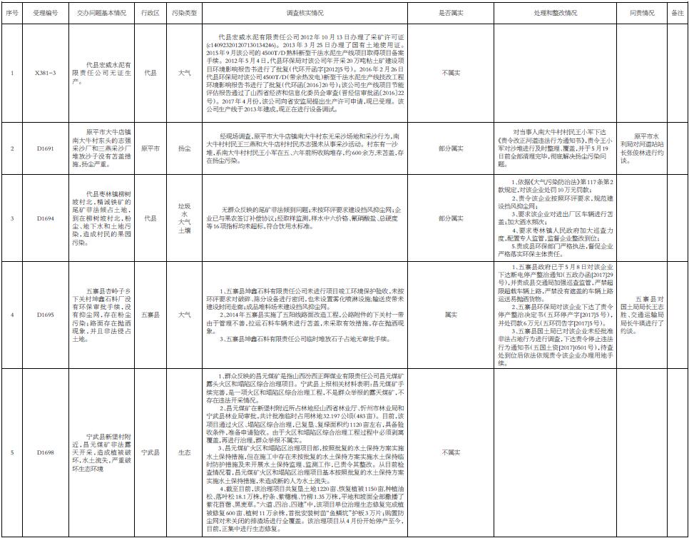 2017年5月15日晚,收到省群眾反映問題處置組督辦的第十七批群眾反映問題共計5件。其中重點案件4件。 我市高度重視,立即組織查處,截至5月18日,督辦的5件群眾反映問題已辦結(jié)。其中,確認(rèn)屬實1件;確認(rèn)部分屬實2件;確認(rèn)不屬實2件。對于屬實和部分屬實已辦結(jié)的環(huán)保問題,分別采取了相應(yīng)處理措施,其中停產(chǎn)整治1件,罰款6萬元,對3名相關(guān)責(zé)任人進行約談。對5件群眾反映問題調(diào)查處理情況進行了信息公開。 忻州市第十七批邊督邊改及公開情況統(tǒng)計表(截至5月18日)