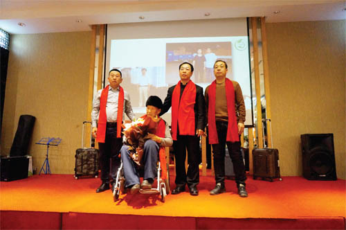 2017年公司年會上,趙吉財(坐輪椅者)接受公司股東、員工致敬。右二為趙新文。