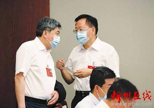 圖為忻州市長朱曉東代表(左)和劉予強(qiáng)代表在交流。