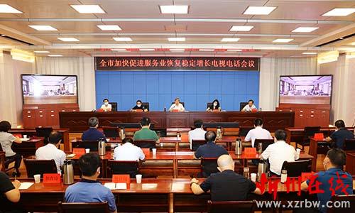 全市加快促進服務業(yè)恢復穩(wěn)定增長電視電話會議。范濤 攝 本報訊 (記者任逢春)6月22日,在聚力“雙過半”沖刺期的關(guān)鍵節(jié)點,我市召開會議,傳達貫徹全省加快促進服務業(yè)恢復穩(wěn)定增長電視電話會議精神,安排部署我市擴內(nèi)需促消費、穩(wěn)就業(yè)保就業(yè)、加快促進服務業(yè)恢復穩(wěn)定增長等工作。市長朱曉東主持會議并講話。副市長王月娥、武憲堂、范建民,市政府秘書長郭寶厚出席會議。
