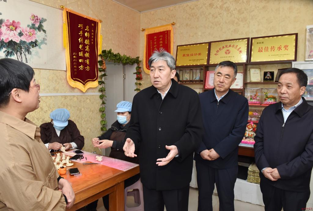 非遺傳承人李紅霞主要從事面塑工藝品和花饃制作與銷售工作,由她創(chuàng)辦的紅霞鄉(xiāng)情守藝坊,吸收了當(dāng)?shù)責(zé)o業(yè)和老弱病殘人員20余人。走訪中,朱曉東來到李紅霞處,詳細(xì)了解面塑的歷史、現(xiàn)狀、未來發(fā)展方向,詢問她在經(jīng)營、培訓(xùn)、傳承中存在的困難和問題。朱曉東指出,非遺傳承人是非物質(zhì)文化遺產(chǎn)重要的承載者和傳承者,在傳統(tǒng)文化和民間藝術(shù)的延續(xù)發(fā)展中發(fā)揮著關(guān)鍵性作用。要積極主動為傳承人搭建展示推廣平臺,讓珍貴的傳統(tǒng)技藝有序、有效傳承下去。希望傳承人進(jìn)一步堅(jiān)定文化自信,結(jié)合時代發(fā)展的特點(diǎn),不斷推陳出新,做好產(chǎn)品研發(fā)和創(chuàng)新,注重實(shí)用價值轉(zhuǎn)化,在宣傳、品質(zhì)、特色和工業(yè)化、標(biāo)準(zhǔn)化方面下功夫,開展好授徒傳藝,賦予非遺項(xiàng)目新的活力,將“小花饃”產(chǎn)業(yè)做大做強(qiáng)。