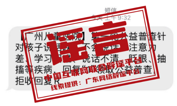 真相:近期,有社會醫(yī)療機構冒用廣州市婦女兒童醫(yī)療中心(以下簡稱“廣州婦兒中心”)名稱,通過群發(fā)短信的方式,宣傳該中心正在進行“身高普查”“針對孩子說話晚,不會說話、注意力差等”等公益普查項目。對此,廣州婦兒中心發(fā)布聲明稱,目前,該中心未就上述公益普查項目與其他任何醫(yī)療機構或社會組織存在合作關系,也未曾通過短信、電話向廣大患者推送過醫(yī)療信息。特此提醒廣大市民,切勿輕信此類信息,并注意保護個人隱私。(來源:廣東省互聯(lián)網(wǎng)舉報中心)