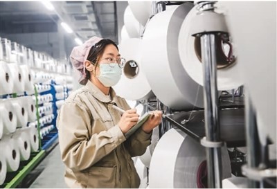 江蘇省宿遷市泗陽(yáng)縣近年來(lái)加快推動(dòng)紡織企業(yè)生產(chǎn)數(shù)字化轉(zhuǎn)型,實(shí)現(xiàn)高質(zhì)量發(fā)展。圖為江蘇芮邦科技有限公司生產(chǎn)車間內(nèi),工人在智能化生產(chǎn)線上作業(yè)。裴 成攝(人民視覺)