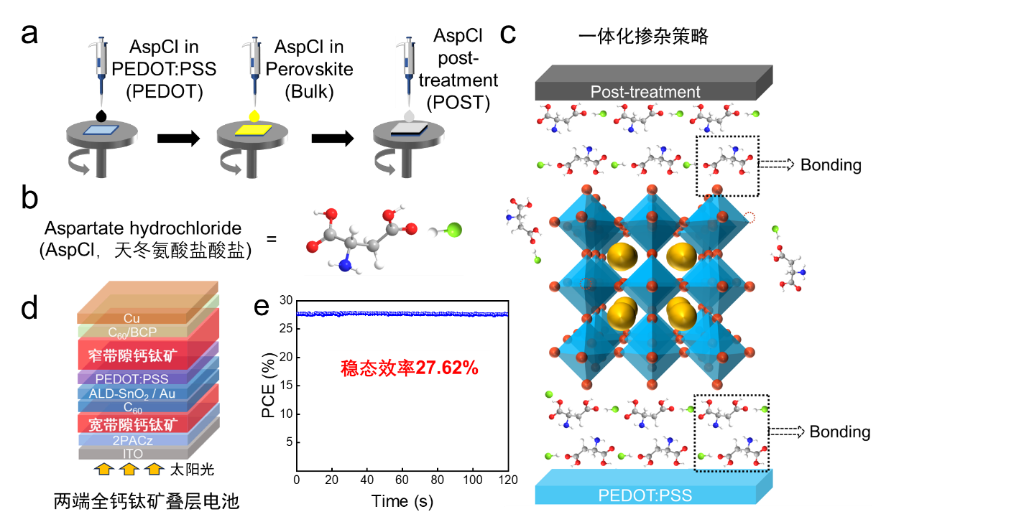 經(jīng)過(guò)長(zhǎng)期攻關(guān),武漢大學(xué)物理科學(xué)與技術(shù)學(xué)院柯維俊教授、方國(guó)家教授團(tuán)隊(duì)在探索全鈣鈦礦疊層太陽(yáng)能電池性能提升方面有了新進(jìn)展,創(chuàng)造性提出天冬氨酸鹽酸鹽一體化摻雜策略,有效提高了窄帶隙鈣鈦礦子電池的效率和穩(wěn)定性,為進(jìn)一步提升電池性能找到新途徑。相關(guān)研究成果近日發(fā)表在《自然》雜志上。 據(jù)介紹,新型金屬鹵化物鈣鈦礦具有制備工藝簡(jiǎn)單、缺陷容忍度高、吸收系數(shù)高、載流子擴(kuò)散長(zhǎng)度長(zhǎng)等優(yōu)點(diǎn),在光電子器件領(lǐng)域備受關(guān)注,被業(yè)內(nèi)認(rèn)為是極具前景的下一代光伏材料之一。 論文通訊作者之一、武漢大學(xué)物理科學(xué)與技術(shù)學(xué)院教授柯維俊表示,在實(shí)際應(yīng)用中,全鈣鈦礦疊層太陽(yáng)能電池由頂部的寬帶隙鈣鈦礦子電池和底部的窄帶隙鈣鈦礦子電池一體化疊加而成,而其中不夠優(yōu)異的窄帶隙鈣鈦礦子電池是其未來(lái)實(shí)現(xiàn)商業(yè)化應(yīng)用的絆腳石之一。 為此,研究團(tuán)隊(duì)將天冬氨酸鹽酸鹽引入到全鈣鈦礦疊層太陽(yáng)能電池底部的空穴傳輸層、鈣鈦礦體吸光層和上界面層中,開(kāi)發(fā)了一種采用同一分子處理的一體化摻雜策略,極大地改善了鈣鈦礦薄膜的質(zhì)量。除了與鈣鈦礦前驅(qū)體配位外,天冬氨酸鹽酸鹽分子還具有很強(qiáng)的分子間氫鍵,富集在鈣鈦礦上、下界面處的天冬氨酸鹽酸鹽因此充當(dāng)了鈣鈦礦層和傳輸層界面之間的分子鎖,進(jìn)一步提升了鈣鈦礦材料的性能和穩(wěn)定性。 此外,如何抑制窄帶隙鈣鈦礦子電池中不穩(wěn)定的二價(jià)錫金屬離子自發(fā)氧化也是行業(yè)痛點(diǎn)之一。此項(xiàng)研究結(jié)果表明天冬氨酸鹽酸鹽可以有效抑制二價(jià)錫金屬離子氧化,減少有害的四價(jià)錫雜質(zhì)。不僅如此,天冬氨酸鹽酸鹽的引入還可以鈍化鈣鈦礦材料的缺陷,調(diào)節(jié)費(fèi)米能級(jí),抑制有害的離子遷移等,從而加強(qiáng)器件的性能和穩(wěn)定性。