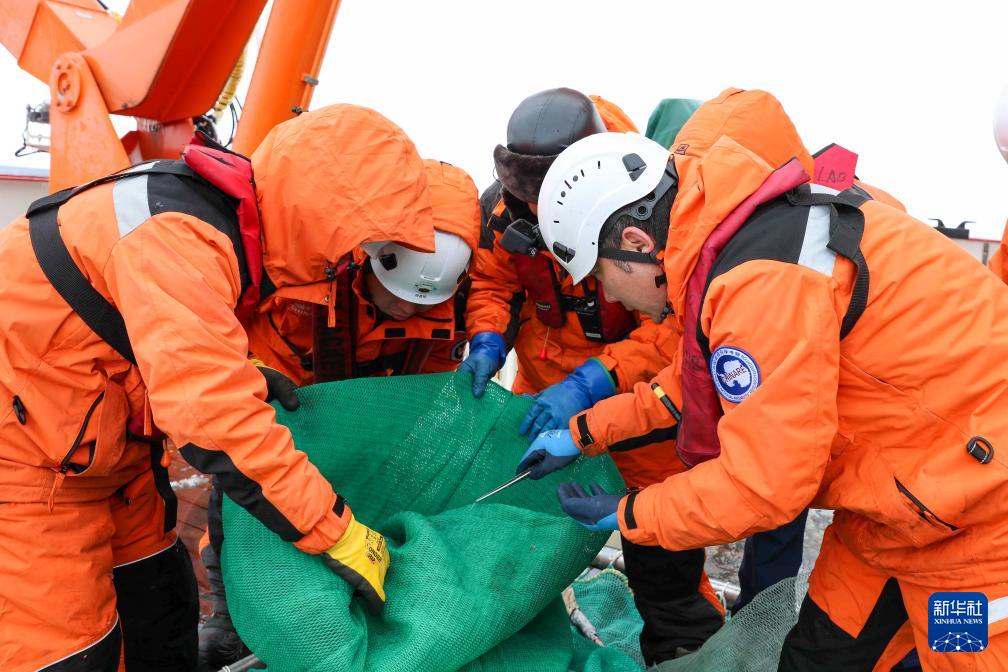 北京時間2024年1月5日凌晨,在“雪龍2”號艉甲板,中國第40次南極考察隊開始了抵達(dá)阿蒙森海后的首次考察作業(yè)。新華社記者 周圓 攝