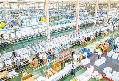 4月25日,在江蘇省宿遷市蘇宿工業(yè)園區(qū)的江蘇皓峰電器有限公司生產(chǎn)車間內(nèi),技術(shù)人員在生產(chǎn)加工銷往海內(nèi)外市場的智能洗衣機(jī)。陳少帥攝(人民視覺)