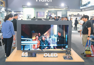4月16日,在廣東省廣州市舉行的第135屆廣交會(huì)上,客商在了解、選購海爾OLED電視。新華社記者 盧漢欣攝