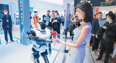 3月14日,在上海市舉辦的中國家電及消費(fèi)電子博覽會(huì)上,海爾公司的AI人形家庭機(jī)器人現(xiàn)場向人們贈(zèng)送玫瑰。陳玉宇攝(人民視覺)
