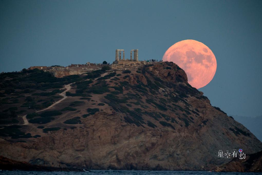 2023年8月30日,“超級月亮”從希臘蘇尼翁角的波塞冬廟上空升起。新華社發(fā)(馬里奧斯·羅洛斯攝)