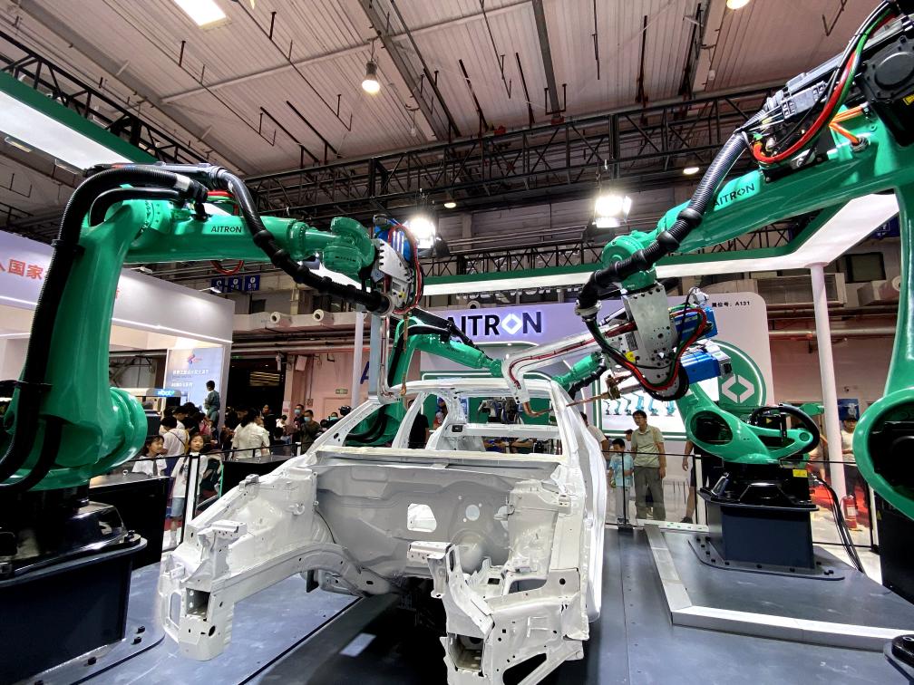 8月24日,在2024世界機器人大會展廳內,六軸機器人伸展鋼鐵手臂,為觀眾現(xiàn)場展示汽車自動化焊接技術。