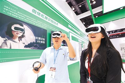 隨著數(shù)字金融領(lǐng)域創(chuàng)新成果不斷投入應(yīng)用,刷掌支付、虹膜識別支付等支付手段逐步走進(jìn)居民生活。圖為觀眾在2024中國國際金融展上通過虛擬現(xiàn)實設(shè)備體驗微信虹膜識別技術(shù)。陳曉根攝(人民視覺)