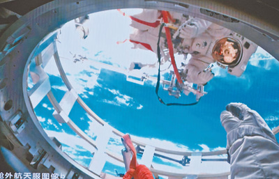 在北京航天飛行控制中心拍攝的航天員蔡旭哲(上)、宋令東(下)在氣閘艙艙門內(nèi)外工作的畫面。