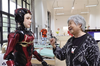 在深圳市養(yǎng)老護(hù)理院,一名老人與人形機(jī)器人“夏瀾”互動(dòng)。新華社記者 梁旭 攝