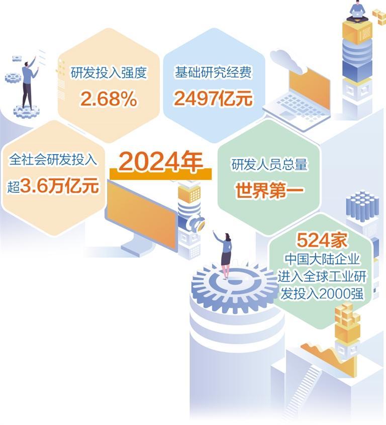 科技投入持續(xù)增加。2024年全社會研發(fā)投入超3.6萬億元,較2020年增長48%;研發(fā)投入強(qiáng)度達(dá)2.68%,超過歐盟國家平均水平;研發(fā)人員總量世界第一?;A(chǔ)研究經(jīng)費(fèi)達(dá)2497億元,較2020年增長超過70%,在量子科技、生命科學(xué)、物質(zhì)科學(xué)、空間科學(xué)等領(lǐng)域取得一批重大原創(chuàng)性成果,高水平國際期刊論文數(shù)量和國際專利申請量連續(xù)5年世界第一。