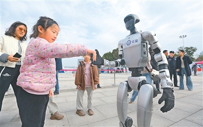 10月25日,江蘇省揚(yáng)州市公安局在揚(yáng)州市明月湖廣場舉行警營開放日活動(dòng),現(xiàn)場設(shè)立多個(gè)主題互動(dòng)展區(qū),市民可以近距離接觸警務(wù)裝備。圖為人形機(jī)器人與小朋友互動(dòng)。孟德龍攝(人民視覺)