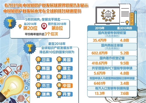 9月14日,中國國家知識產(chǎn)權(quán)局知識產(chǎn)權(quán)發(fā)展研究中心發(fā)布的《2019年中國知識產(chǎn)權(quán)發(fā)展狀況評價報告》顯示,中國知識產(chǎn)權(quán)發(fā)展水平在全球的排名快速提升,短短5年時間內(nèi),排名已從2014年的第20位,快速躍升至2018年的第8位,平均每年提升近3個位次。