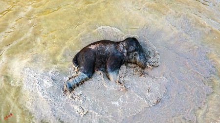 象群飽餐一頓,到了玩耍時(shí)間。它們轉(zhuǎn)到一個(gè)魚塘邊,幾頭野象滑到魚塘里“洗澡”,在水里不停翻滾,嚇得魚兒都跳出了水面。在岸上,有的野象把水桶踢著玩,還有的爭(zhēng)搶水管當(dāng)玩具……