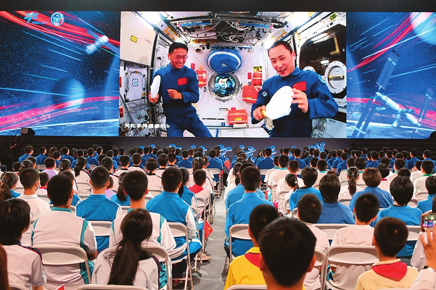 9月21日下午,“天宮課堂”第四課在中國空間站開講,新晉“太空教師”景海鵬、朱楊柱、桂海潮為廣大青少年帶來一場精彩的太空科普課,這是中國航天員首次在夢天實驗艙內(nèi)進(jìn)行授課。