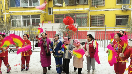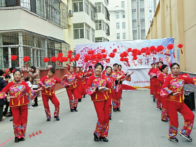 活動(dòng)現(xiàn)場(chǎng)鑼鼓喧天,伴隨著歡快激昂的鑼鼓聲,秧歌隊(duì)員們頭戴花冠,身著五顏六色服飾,甩著彩綢、舞動(dòng)著彩扇,個(gè)個(gè)神態(tài)昂揚(yáng),手中的扇子、紅綢等隨著鼓點(diǎn)時(shí)而上下翻飛,時(shí)而左右擺動(dòng),讓人眼花繚亂。扭出了秧歌的熱情與奔放,營造了和諧、愉快、團(tuán)結(jié)的節(jié)日氛圍,圍觀的居民們紛紛鼓掌叫好,不禁拿起手機(jī)記錄這喜慶的時(shí)刻。
