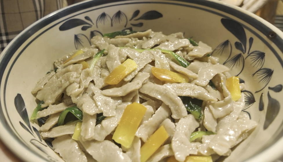 當(dāng)然,最好用的工具當(dāng)屬做面的“魔法棒”——手指。用手指將莜面的小面團(tuán)搓成橄欖形,上鍋一蒸,就成了“莜面魚魚”;將面團(tuán)放在砧板上,用手掌后部往前推壓成薄片,就成了“栲栳栳”;將面團(tuán)分切成小面丁以后,用大拇指一抿,就成了“貓耳朵”;將小麥面加一兩種雜糧面混勻后和成較軟的面團(tuán),勻速將面擠壓出手指縫,就成了“握流流”。在“魔法棒”的作用下,面團(tuán)變成了各式各樣的美餐,給山西人帶來了無盡舌尖上的享受。