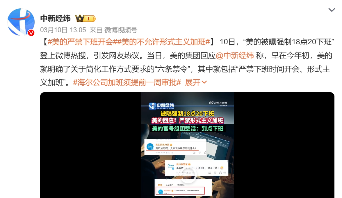 美的回應(yīng)媒體時表示,今年以來,美的明確了關(guān)于簡化工作方式要求的“六條禁令”,其中就包括“嚴禁下班時間開會、形式主義加班”。