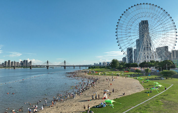 游人在位于江西省南昌市紅谷灘區(qū)的摩天灣天然泳場(chǎng)戲水納涼(6月27日攝)。新華社記者 萬象 攝