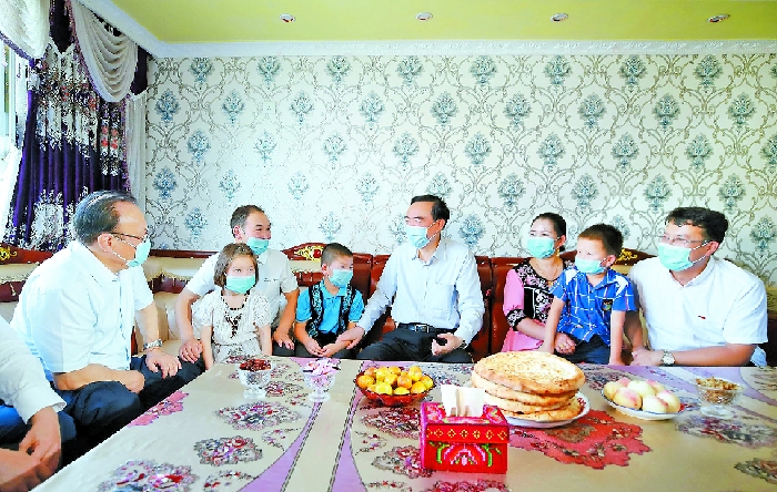 日前,自治區(qū)黨委書(shū)記陳全國(guó),自治區(qū)黨委副書(shū)記、自治區(qū)主席雪克來(lái)提·扎克爾在克孜勒蘇柯?tīng)柨俗巫灾沃菡{(diào)研統(tǒng)籌推進(jìn)常態(tài)化疫情防控和經(jīng)濟(jì)社會(huì)發(fā)展工作。這是陳全國(guó)、雪克來(lái)提·扎克爾在阿克陶縣絲路佳苑易地扶貧搬遷安置點(diǎn),走進(jìn)建檔立卡貧困戶穆拉提·艾海提家中,關(guān)心詢問(wèn)搬遷后的生活情況,勉勵(lì)他們持續(xù)增收致富,把日子越過(guò)越好。 崔志堅(jiān)攝