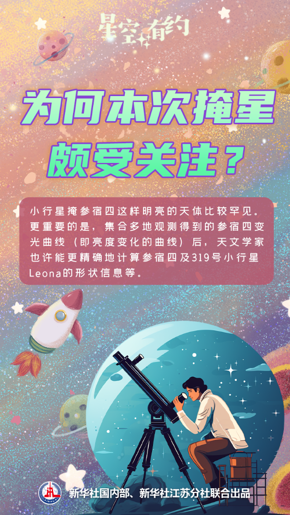 太陽系的行星、小行星等在移動時,時常會掩住遠(yuǎn)處的恒星。不過,小行星掩參宿四這樣明亮的天體比較罕見?!皯{肉眼看到參宿四明顯變暗或‘消失’,將會是一次難得的體驗(yàn)?!蓖蹩瞥榻B說,此次掩星不僅有觀賞性,還具有科學(xué)價值。集合多地觀測得到的參宿四變光曲線(即亮度變化的曲線)后,天文學(xué)家也許能更精確地計(jì)算參宿四及319號小行星Leona的形狀信息等。