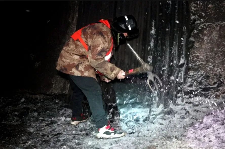 “咣當咣當……”,為了讓列車安全通過隧道,大同工務段的鐵路“打冰人”掄著尖鎬,狠狠地砸向拱壁上的冰柱,加緊隧道內(nèi)的除冰作業(yè)。
