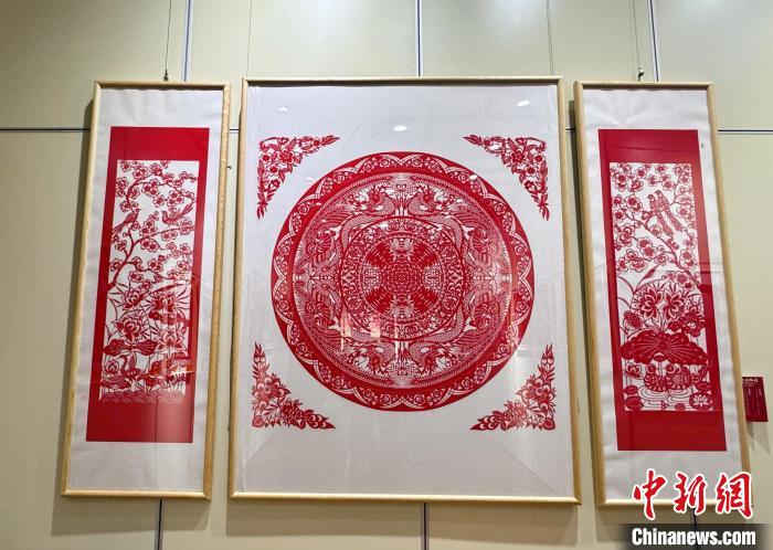 現(xiàn)場展出的盤合作品和《婚俗服飾》系列剪紙作品。楊靜攝