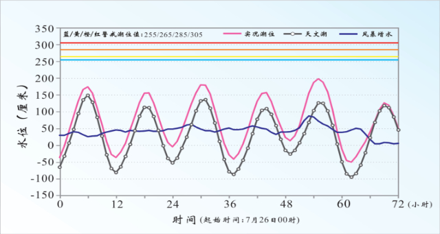 2023年7月28日“杜蘇芮”臺風(fēng)風(fēng)暴潮發(fā)生時,福建東山站實(shí)測潮位、天文潮和風(fēng)暴增水隨時間變化情況,圖中清晰地反映出風(fēng)暴潮與天文潮疊加后,實(shí)時潮位明顯升高。(資料來源:《2023中國海洋災(zāi)害公報(bào)》)